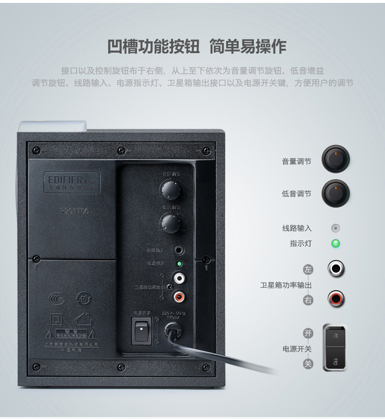 2.1有源音箱、木质箱体、震撼低音、便捷操控、专业小仰角设计、重低音独立调节